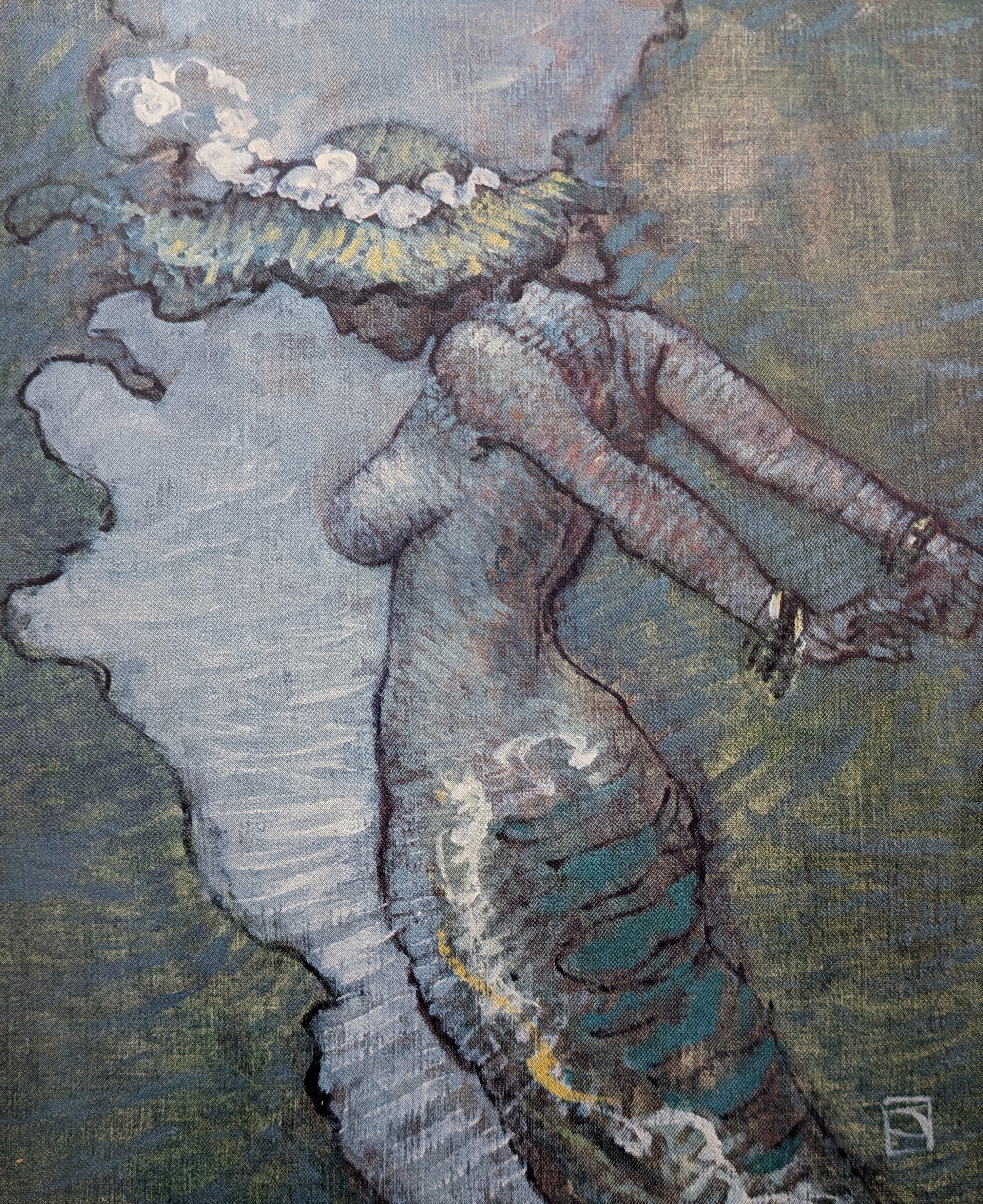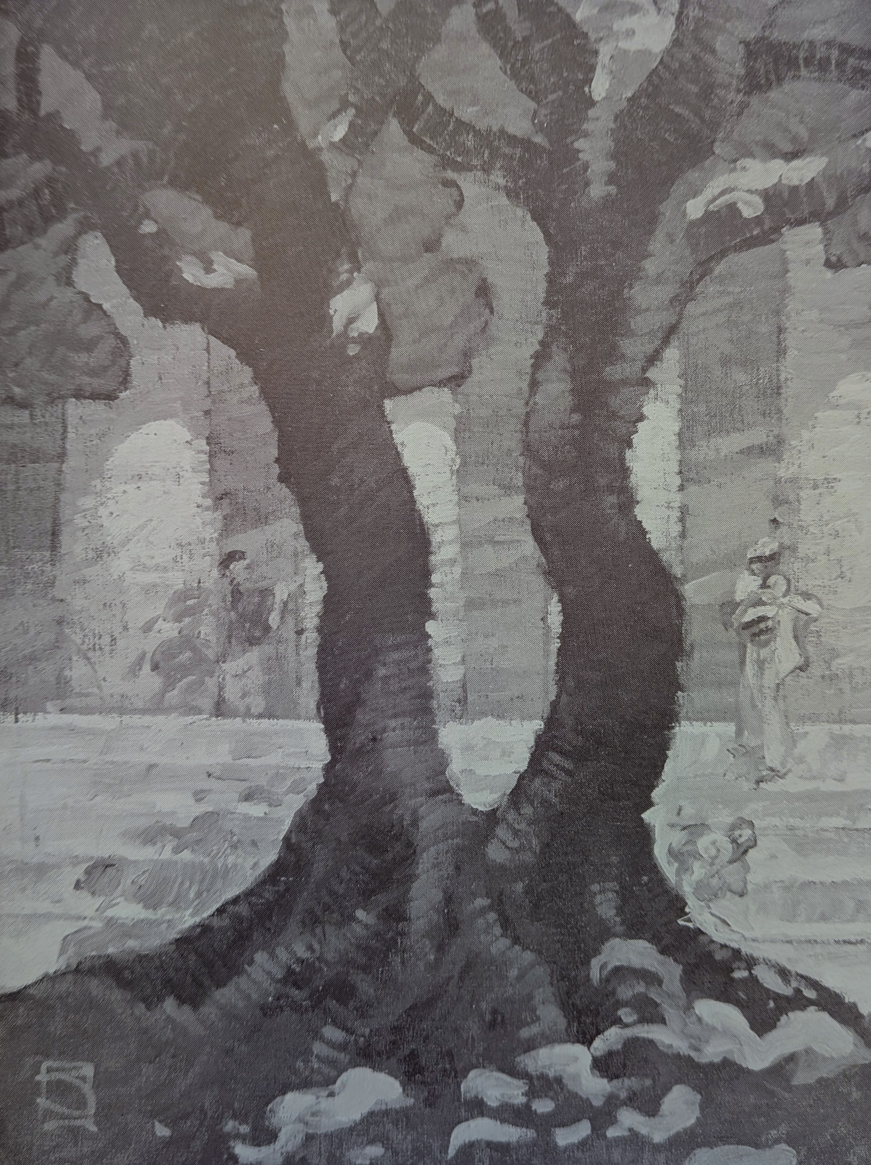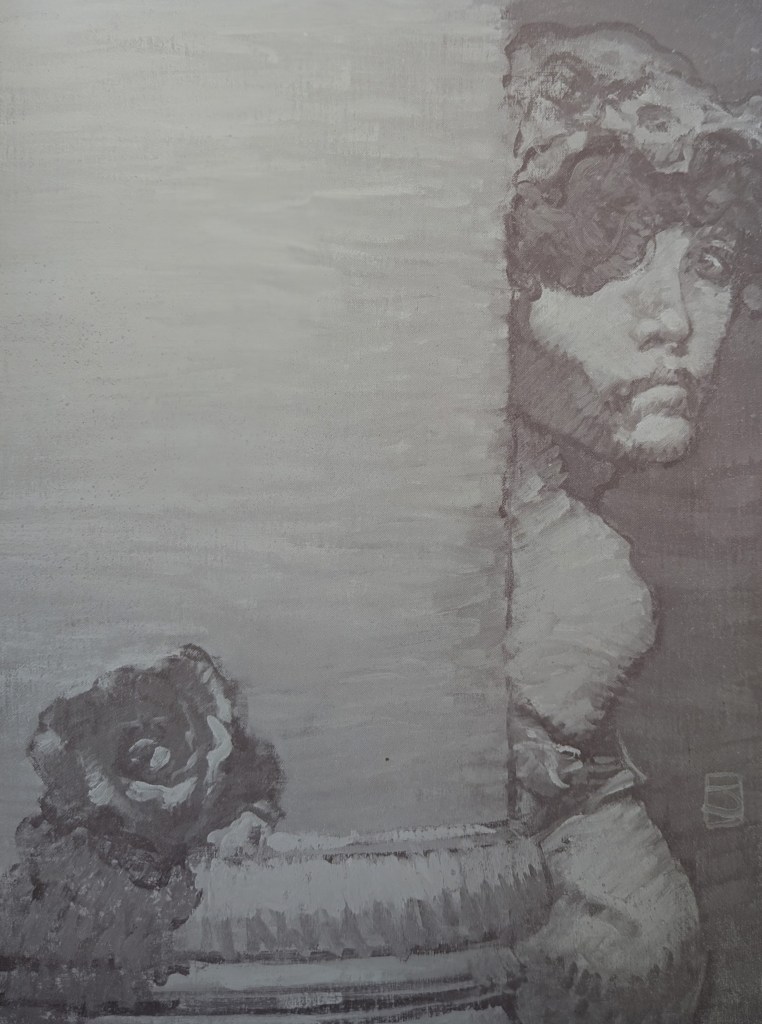 Jones’s work in these paintings is nothing short of brilliant; that said, I don’t think they fit the novel well, if only because Swann incessantly and uniquely mixed the borderline cute (or the “saccharine” as many of his detractors said) with the serious, heavy, and melancholy. Jones’s paintings capture the latter but there’s no place in his greyscale and bluescale images for the rest of Swann’s vision. They are beautiful, but sometimes feel out of place with Swann’s novel, making for an awkward contrast with the pages they sit across from. This issue of contrast also has to do with the fact that none of them, aside from the first, depict scenes from the novel. They are, instead, loving impressions of the late writings of an author who died too early and who felt his novels perpetually underserved by the cover artists chosen to present his books, visually, to the sff world.