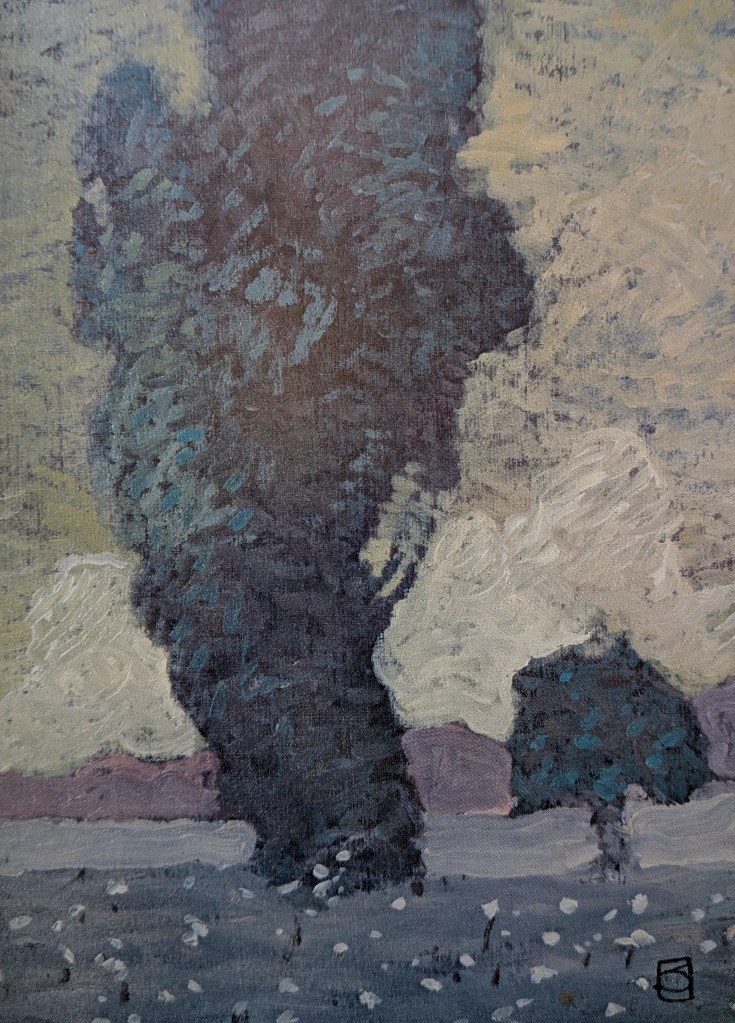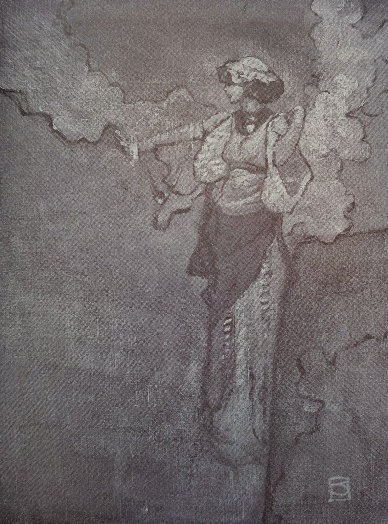 Though Queens Walk in the Dusk did not receive an illustrated dust jacket and was instead bound in a maroon cloth clover with a gold-inlay design of an elephant’s head on the front, ten illustrations by Jones appeared inside the book. One, for the endpapers, depicted the lonely elephant king Iarbas in austere greyscale. Another, across from the title page, was a cutout portrait of Iarbas’s head, used mostly as decoration. But the real beauty of the book and the real value of Jones’s contribution to Swann’s novel is the eight nearly full-page paintings that were hand-glued into the two thousand editions of the novel. The paintings are heart-breakingly beautiful and I have been unable to find reproductions of them anywhere online, so I’ve carefully photographed them all and provided them in the gallery below.